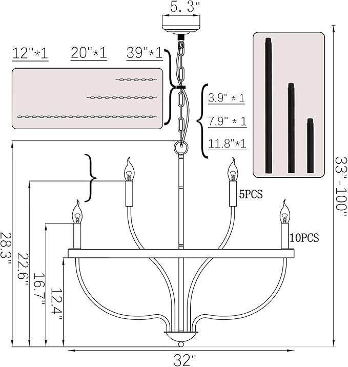 【Height Adjustable Chandelier】This Black Chandelier Fixture Features A Unique Three-Section Chain And Four-Section Boom. The Three Sections Of Chain Measure 12 Inches, 20 Inches And 39 Inches In Length. The Total Chain Length Is 71 Inches. The Four-Section Boom Measures 12\”, 8\” And 4\” In Length. Overall Boom Length Is 23 Inches. Flexible Height Adjustment As Needed.